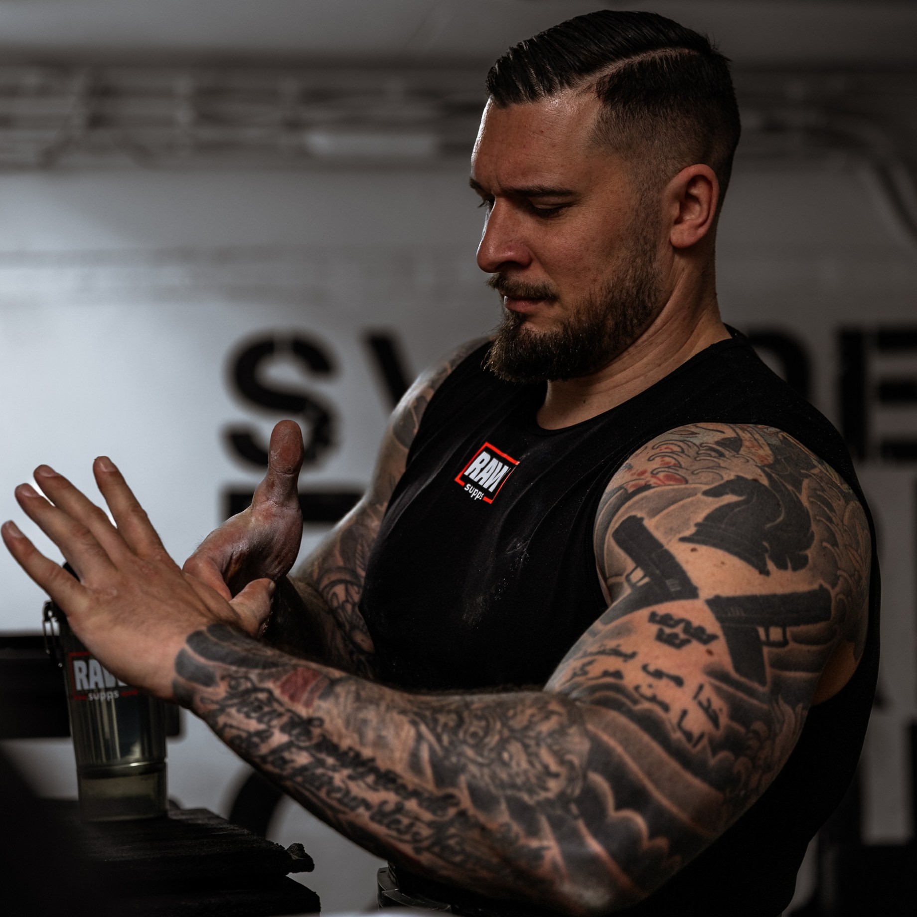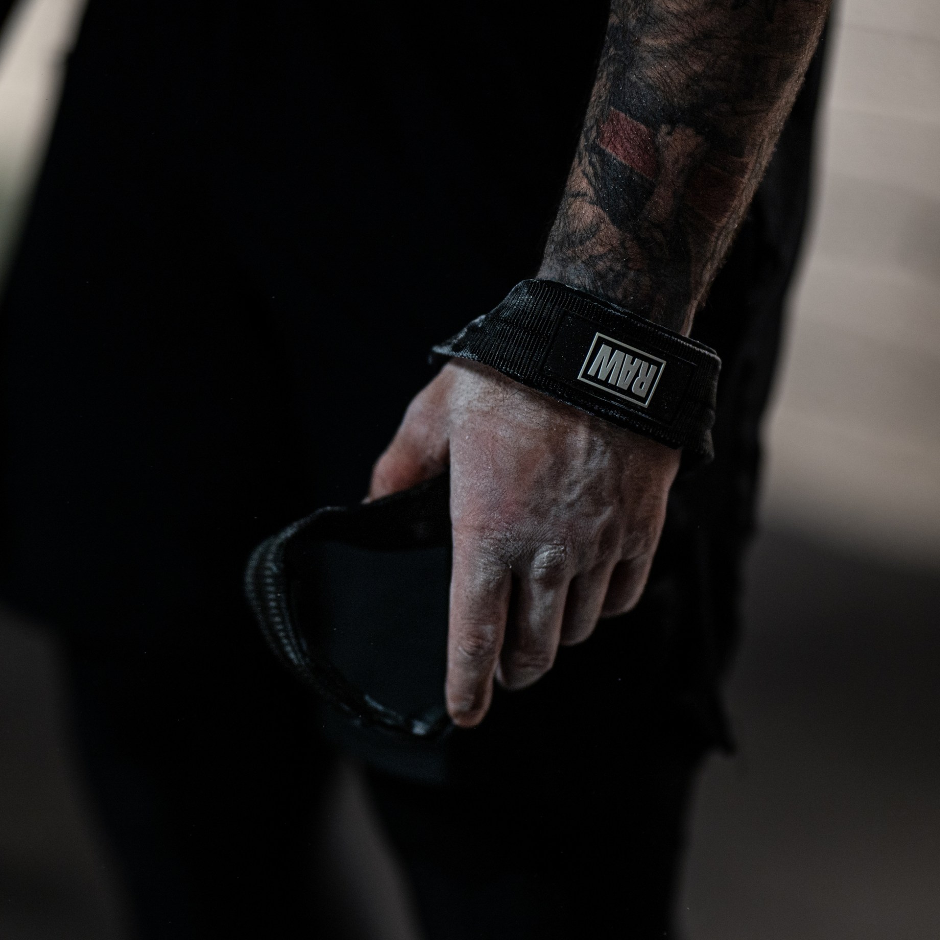 Lähikuva henkilön käsistä ja  RAW Supps Figure 8 Lifting Strapseistä kun hän on lähdössä nostamaan levytankoa.
