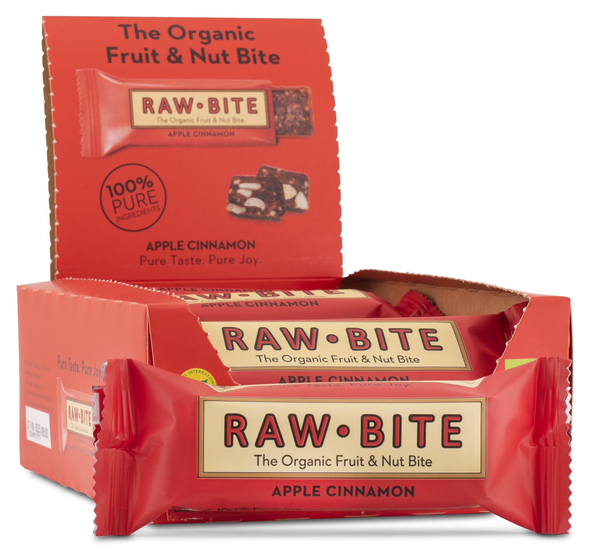 RAWBITE omenan ja kanelin maulla valmistetaan 100 % luonnollisista ja ekologisista ainesosista. Se on hedelmä- ja pähkinäpatukka, joka on täysin maidoton, gluteeniton, kananmunaton, soijaton, sokeriton, sekä vapaa keinotekoisista maku- ja väriaineista. Se on yksinkertaisesti terveellinen patukka, joka sopii erinomaisesti treenilaukkuun tai kahvihetkeen!