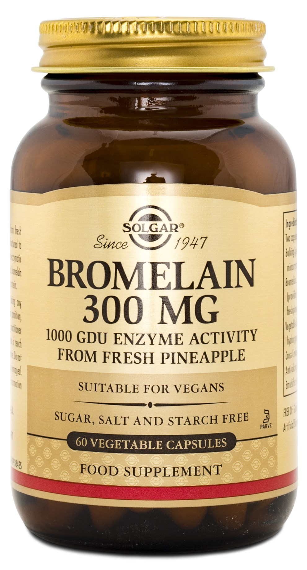 Solgar Bromelain 300 mg sisältää proteiineja hajottavaa entsyymiä nimeltä bromelaiini, jota kutsutaan myös bromeliiniksi. Tämä entsyymi uutetaan ananaksesta, ja se on osasyynä siihen, miksi jotkut ihmiset voivat kokea kutiavaa tunnetta suussa ananasta syödessään. Solgar Bromelain 300 mg:tä käytetään siitepölyallergian, kuten esimerkiksi ruoho- tai koivunsiitepölyn, yhteydessä. Tällöin kyseessä voi olla limakalvojen turvotus, erityisesti nenässä ja poskionteloissa. Käytä Solgar Bromelain 300 mg aterioiden välillä optimoidaksesi sen vaikutuksen. Jos haluat sen sijaan käyttää bromelaiinia ruoansulatuksen tukemiseen, ota kapselit aterian yhteydessä.