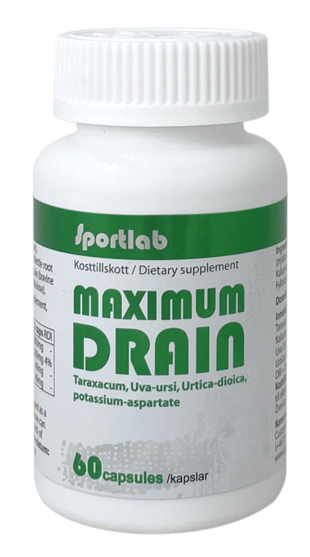 Sportlab Maximum Drain on nestettä poistava ravintolisä, joka sisältää yrttejä. Yrtit auttavat sinua pääsemään eroon ylimääräisestä nesteestä ja sopivat erinomaisesti fitness- ja kehonrakennuskilpailujen edellä. Painoluokkaurheilussa Maximum Drainin käyttö voi auttaa saavuttamaan halutun painon. Yrttikompleksi koostuu muun muassa voikukasta, sianpuolukasta ja nokkosesta, joilla on nesteenpoistovaikutus.