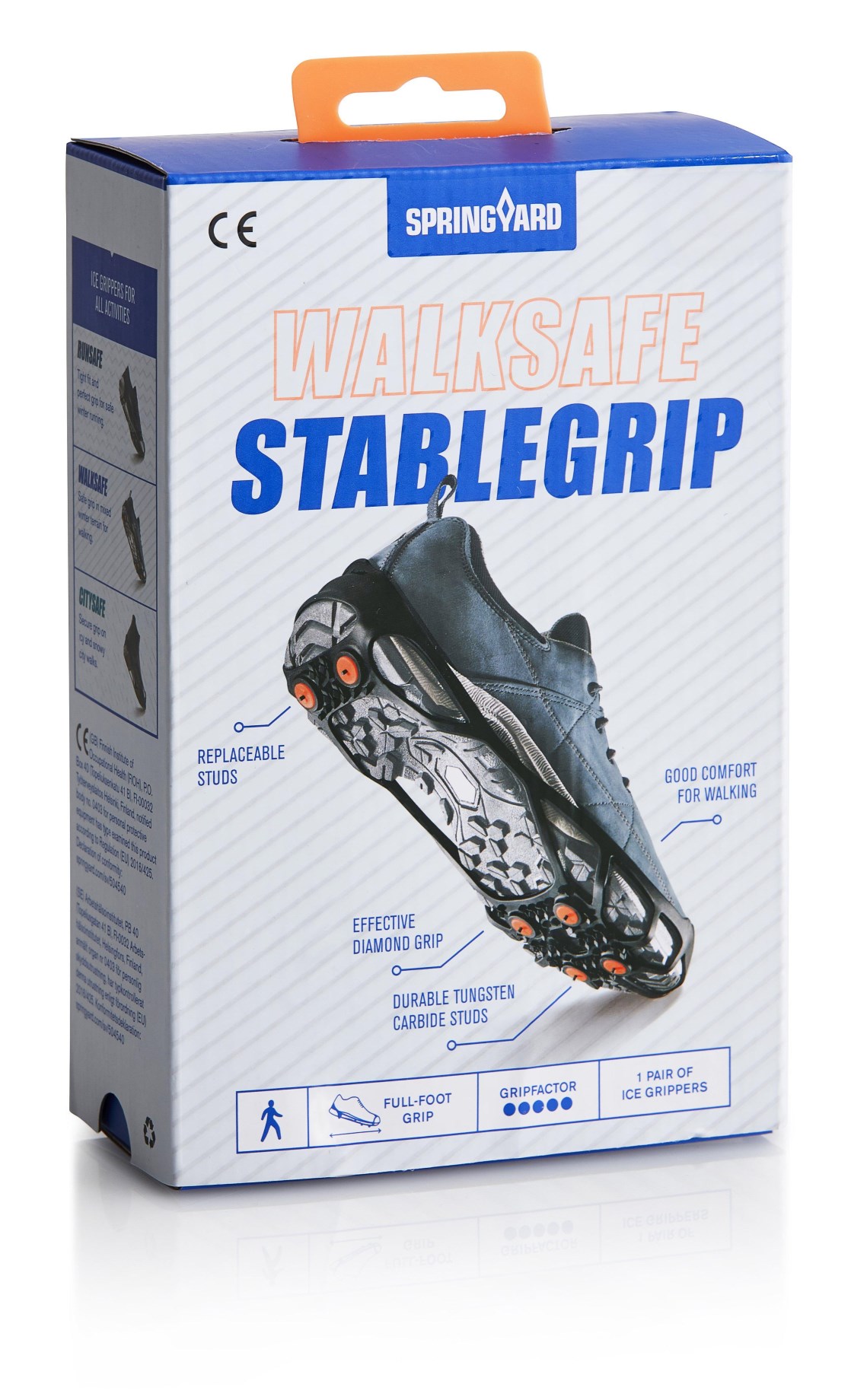 Springyard StableGrip Walksafe on pari liukuesteitä nastoilla, jotka tarjoavat erinomaisen pidon ja korkean mukavuuden kävely- ja vaellusretkilläsi. Nämä liukuesteet ovat valmistettu kestävästä luonnonkumista, jossa on kestävät ja vaihdettavat piikit. Ainutlaatuinen kuuden nastan muotoilu tarjoaa koko jalan suojan ja optimaalisen istuvuuden. Springyard StableGrip Walksafe sopii kaiken tyyppisille kengille, ja ne ovat lisäksi helppoja riisua ja pukea.