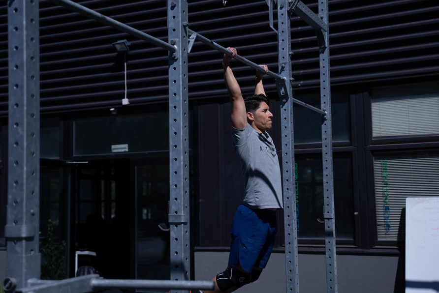 1. Hypää leuanvetotankoon ja roiku suorilla käsillä (muista, että tangon yläpuolella tulee olla tilaa).